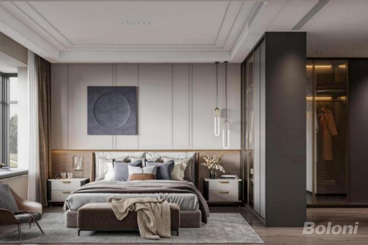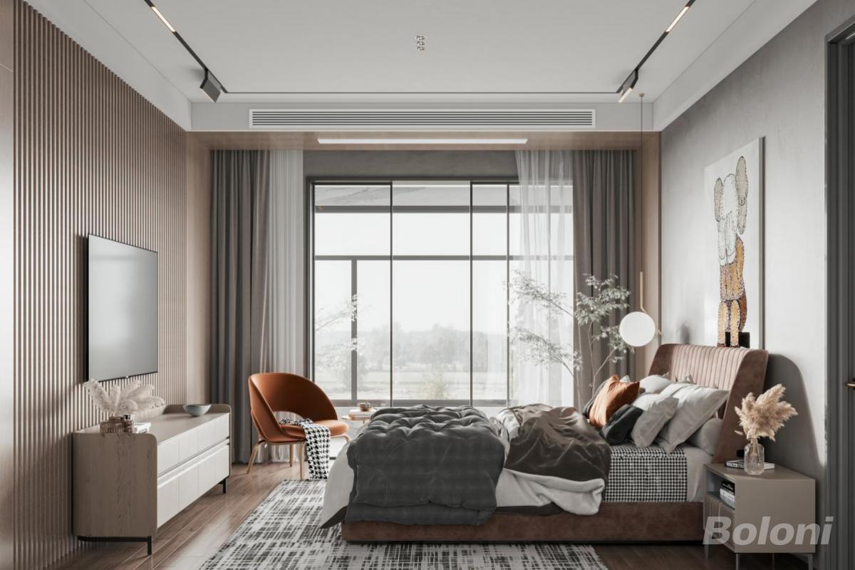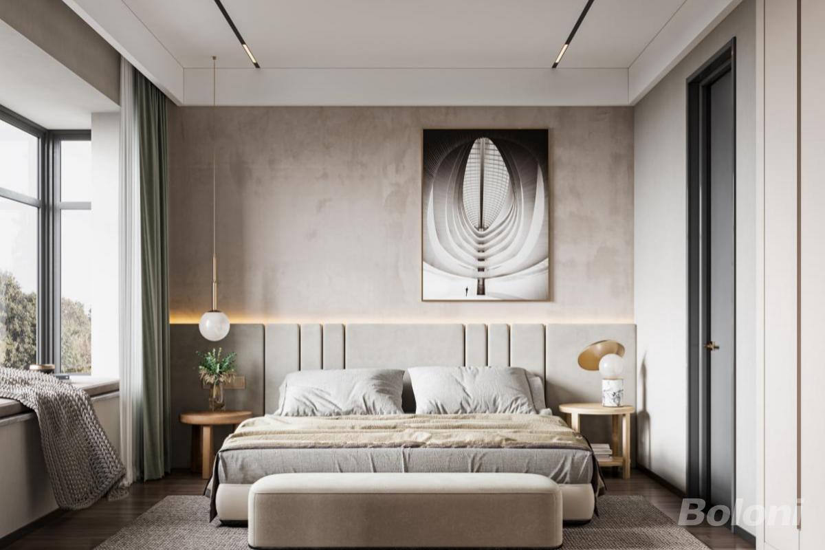 本卧室以低饱和灰调为底,微水泥墙面呼应绒面床头,金属线条隐于灯带与吊灯间。原木边几衬几何挂画,在简约轮廓里,借材质温润与光影层次,凝萃轻奢的静谧优雅 。