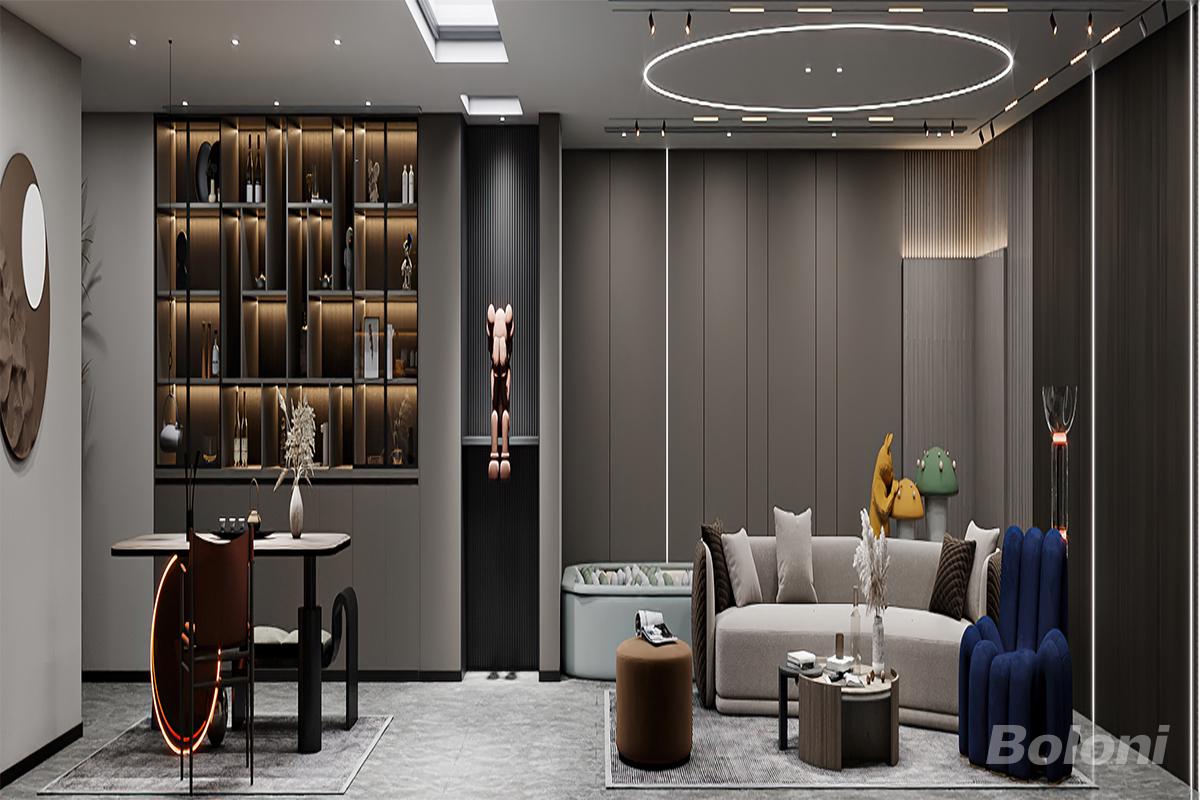 以深灰、浅灰为主调,搭配深蓝、焦糖棕等跳色软装,营造高级冷静的氛围;材质:哑光护墙板+金属线条+大理石纹理背景墙,通过材质对比提升质感;灯光:嵌入式筒灯+悬浮吊顶氛围灯+展示柜灯带,打造层次丰富的“无主灯”照明;细节:弧形灯带、艺术雕塑摆件、隐藏式收纳柜,兼顾美观与实用性。