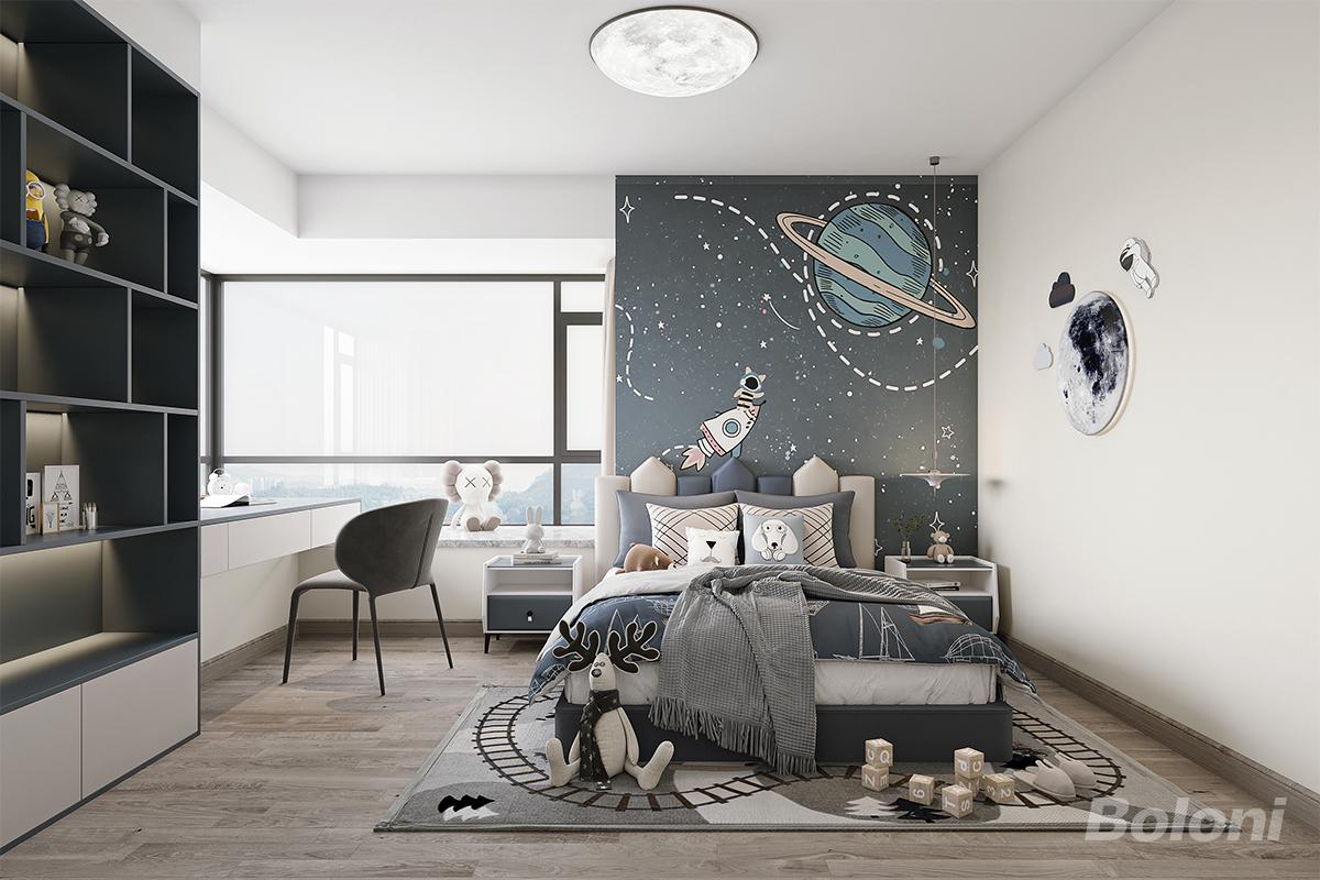 童趣太空主题设计重点:主题:墙面采用星球+火箭壁画,搭配月球造型吸顶灯,打造沉浸式“太空舱”氛围;功能:左侧定制书架+书桌,满足学习收纳需求;床铺搭配软包床头,兼顾安全与舒适;色调:以深蓝、浅灰为主,搭配白色软装,既符合儿童审美,又避免过于花哨。