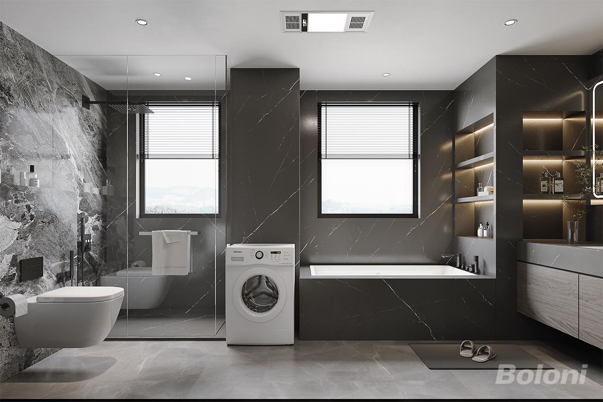 暗黑系轻奢卫浴 材质:深灰色大理石纹理瓷砖+玻璃隔断,提升高级感与通透感; 功能:干湿分离(淋浴区+浴缸区独立),嵌入洗衣机,实现“洗烘浴”一体化;灯光:嵌入式筒灯+壁龛灯带,增强空间精致感;细节:壁挂式马桶+悬空台盆,减少卫生死角,便于清洁。