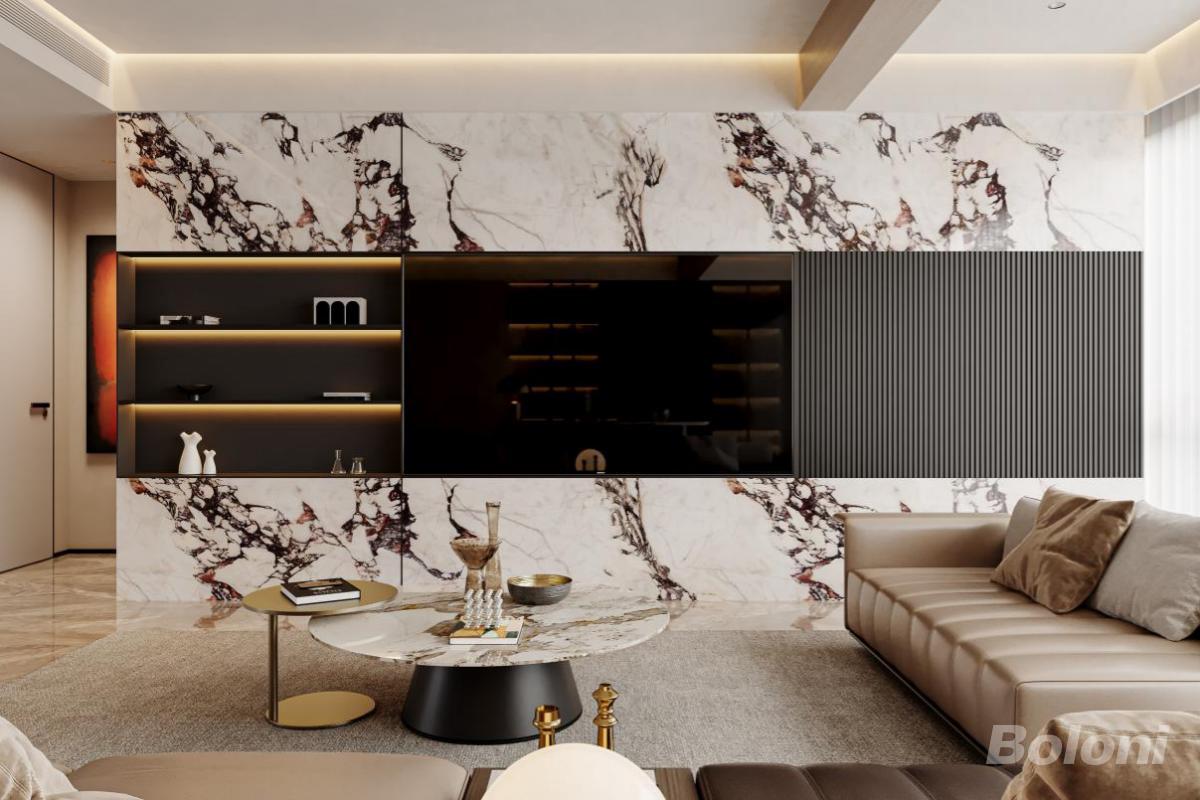 本客厅以奢石背景墙为视觉锚点,天然纹理尽展奢韵。嵌入式灯带点亮收纳区,金属细节(边几、柜体)呼应精致,皮质沙发柔化硬朗。借材质碰撞与光影层次,诠释轻奢“藏奢于简,质胜于华”的格调 。