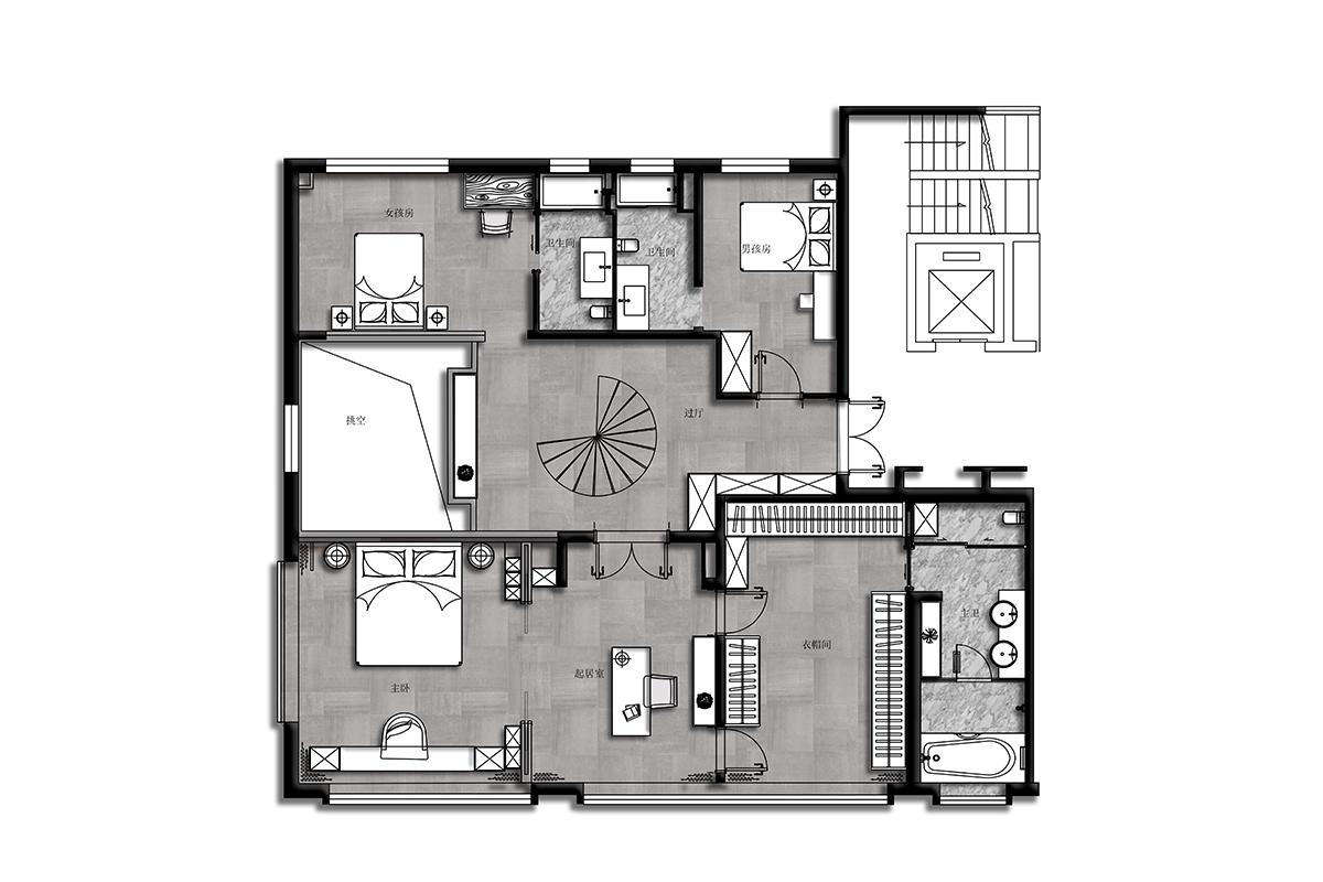 本层定位私密休憩区,以温润木调铺陈优雅基底。螺旋梯延续空间韵律,挑空拓展层次。主卧套房串联花房与衣帽间,金属收边、丝绒肌理碰撞石材冷冽,于低饱和色调间,借定制五金、隐奢灯影,诠释轻奢“私密处见精致”的格调 。