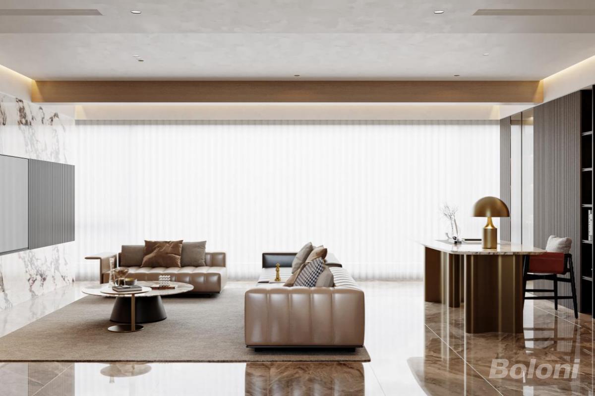 本客厅以大地色系铺陈优雅基底,皮革沙发、大理石材质碰撞温润质感。嵌入式灯带与玻璃陈列柜借光造境,金属细节悄然点睛。于开阔尺度间,凭材质细腻与光影层次,诠释轻奢“藏奢于简”的格调 。