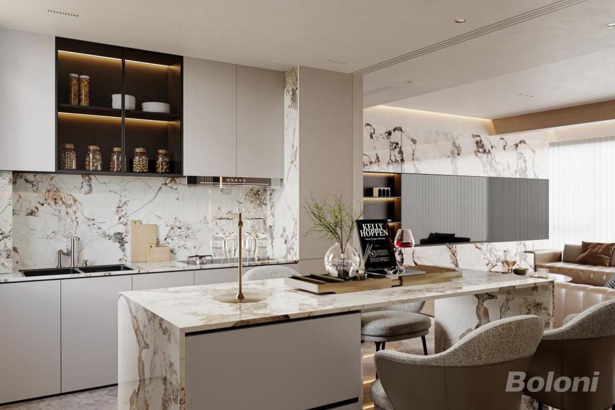 本厨房萃取奢石天然纹理作视觉焦点,岛台与墙面形成呼应。金属饰边勾勒精致轮廓,暗藏灯带点亮开放收纳区,灰调柜体中和华丽。以功能与仪式感的交融,诠释轻奢“简于形,奢于质”的设计哲思 。