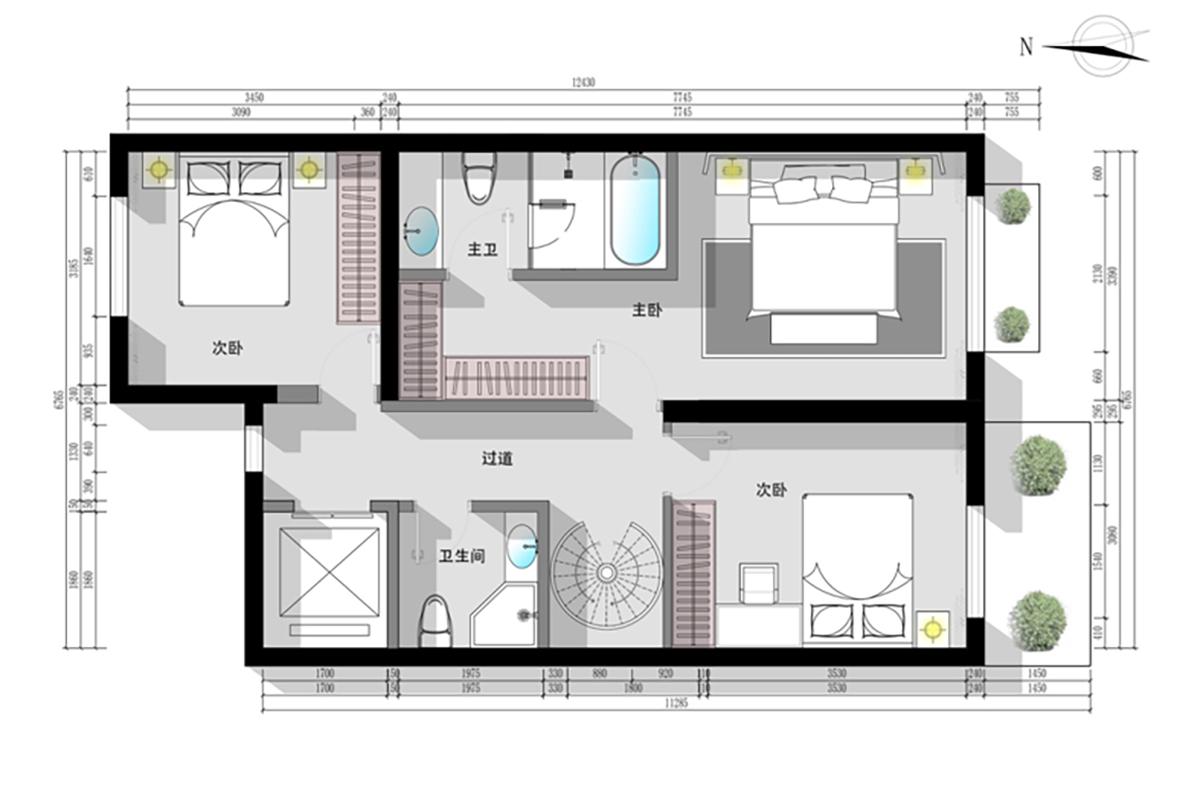以过道串联双次卧与主卧,主卧配独立卫浴保私密,格栅隔断柔化空间边界。各卧室均留采光面,雅奢质感融于分区秩序,既保休憩场域的静谧,又让动线简洁流畅,平衡实用与松弛日常。