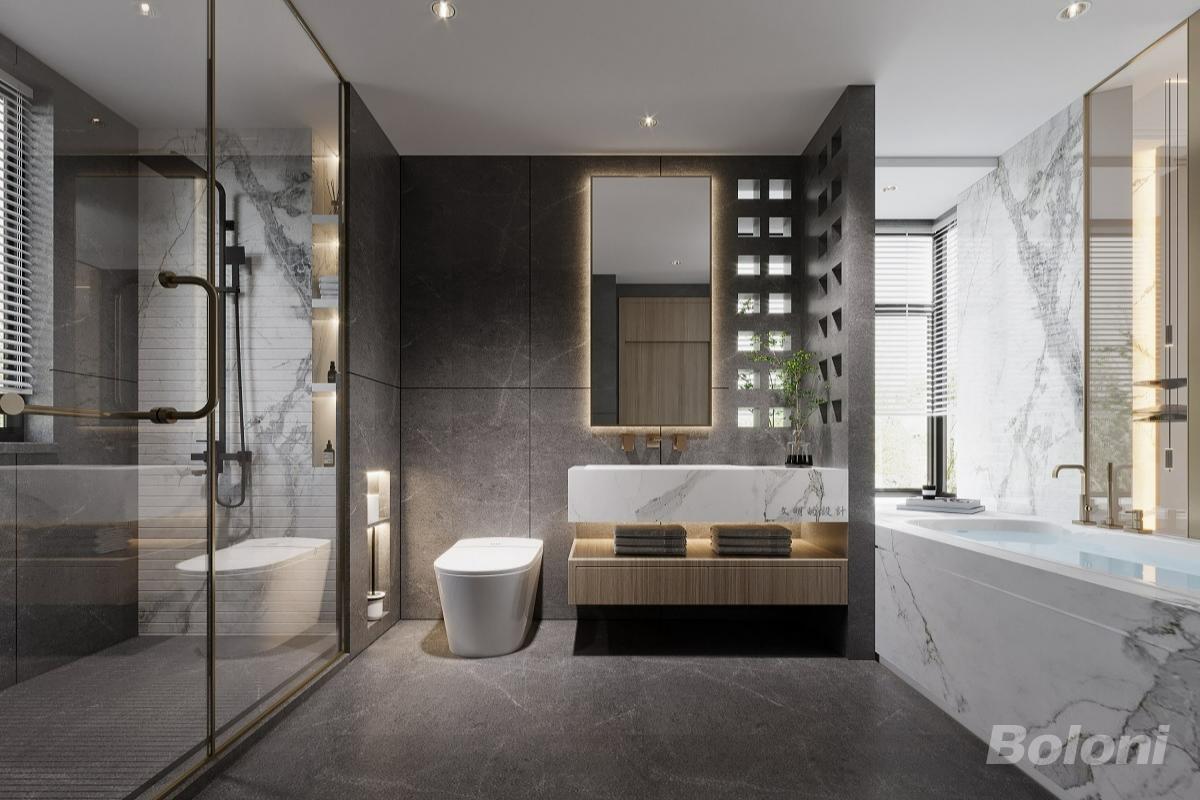 以深灰石纹衬白理石肌理,木色柜面与金属线条柔化冷调,藏光灯带晕染雅致氛围。格栅隔断引光透景,浴缸、智能洁具兼顾奢感与实用,留白处缀绿植,让卫浴空间在秩序中沉淀松弛疗愈的日常质感。