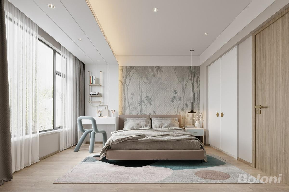 以浅木、柔灰为底,水墨林景墙布晕染雅致氛围,金属线条与柔和灯光轻缀轻奢质感。通透帘幕引自然光入室,低饱和软装衬出松弛,功能区与休憩区自然衔接,让卧室在简雅秩序中沉淀疗愈日常。