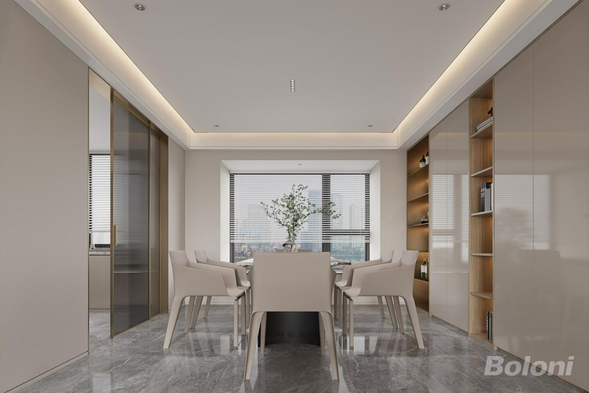 以浅暖色调为底,融玻璃隔断的通透与木色柜体的温润,金属线条轻缀轻奢质感。悬浮吊顶藏光引柔,大理石地面衬出利落,留白间植一抹绿意,让用餐场域在雅致中兼具松弛日常感。