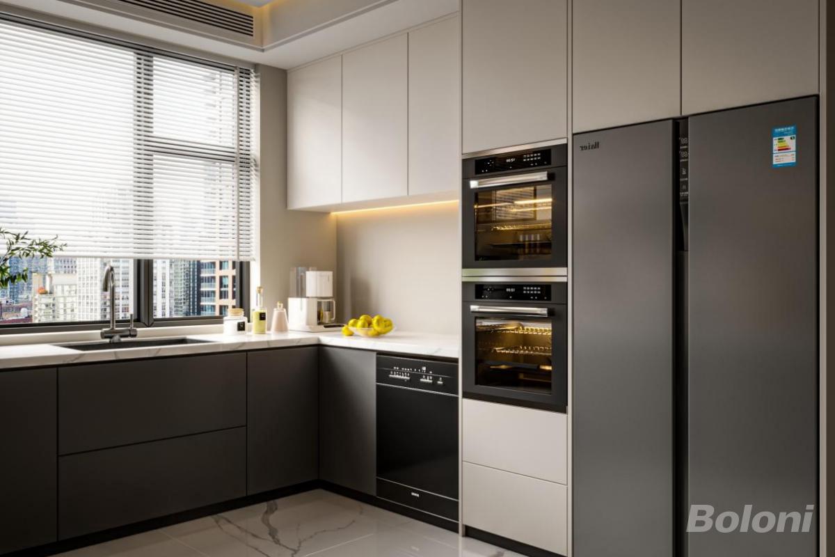 意式轻奢厨房,以高级灰与暖米色铺陈基底,哑光橱柜搭配大理石台面,天然纹理与细腻质感碰撞。嵌入式电器归整秩序,百叶窗柔化光线,暗藏灯带晕染精致,于实用中诠释优雅克制的奢华美学 。