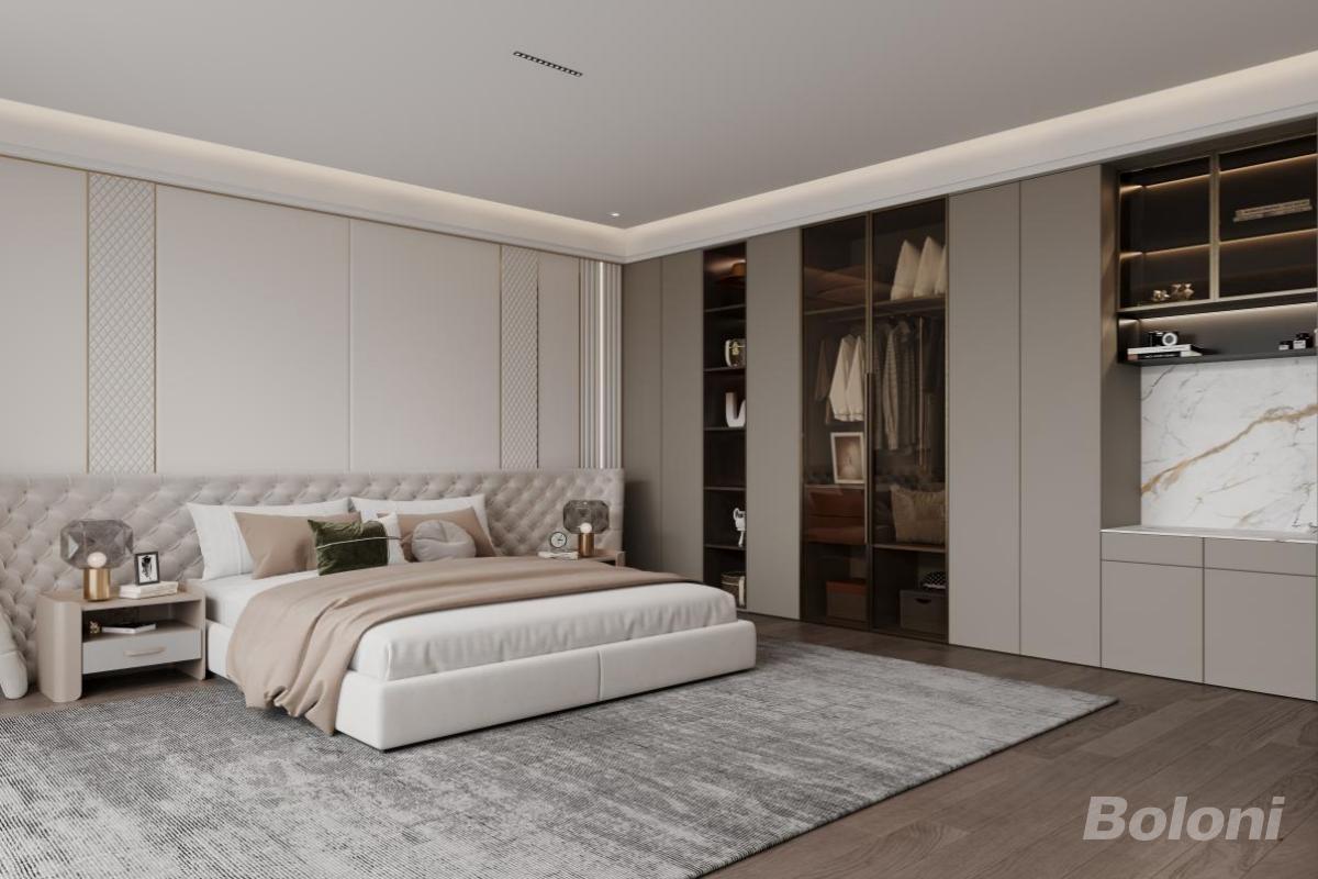 意式轻奢卧室,暖灰基底糅合金属线条,软包床头晕染温柔。玻璃衣柜通透显序,大理石台面藏光韵,灯带勾勒层次。抱枕、陈列暗蕴巧思,于静谧中平衡仪式感,以克制精致诠释睡眠空间的优雅质感 。