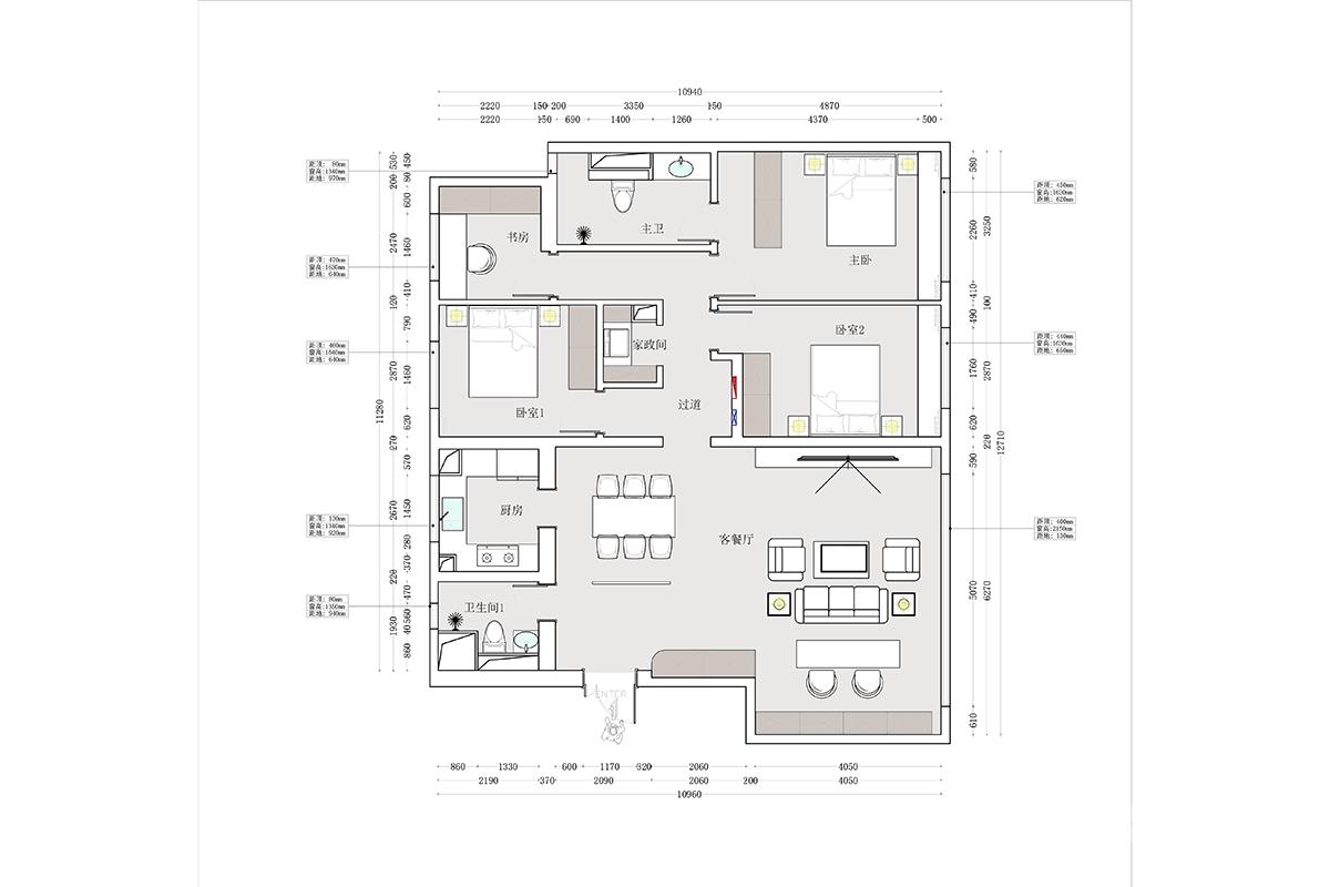 借户型方正通透之基,凝炼意式轻奢精髓:客餐厨一体铺展开阔场域,大理石与哑光金属交织利落韵律,丝绒、肌理面料晕染温润。低饱和暖调沁润,金属饰边、精致缝线藏巧思,平衡仪式感与日常松弛,诠释优雅克制的生活美学 。