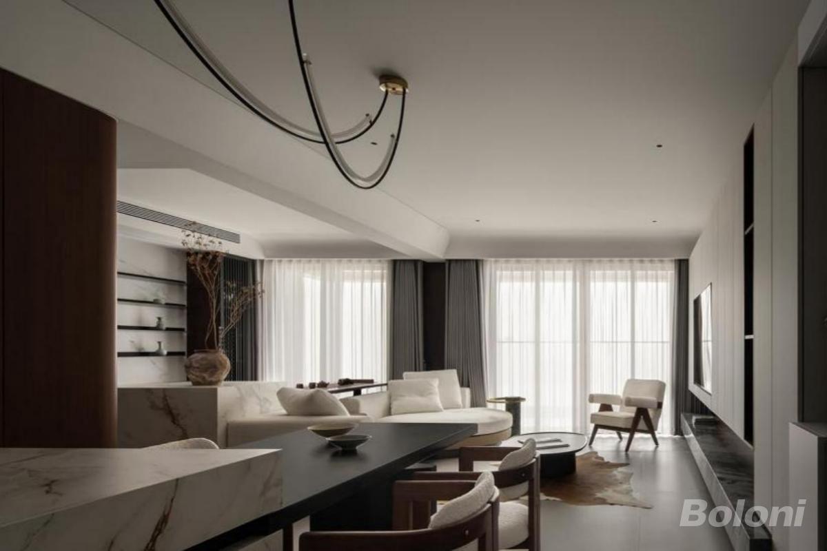 以意式轻奢为核,借大理石的冷冽与胡桃木的温润交织层次。弧形吊灯勾勒韵律,柔纱帘滤入柔光。开放式布局串联流畅动线,金属饰边、肌理面料藏细节,以中性调基底,诠释克制而精致的空间美学 。