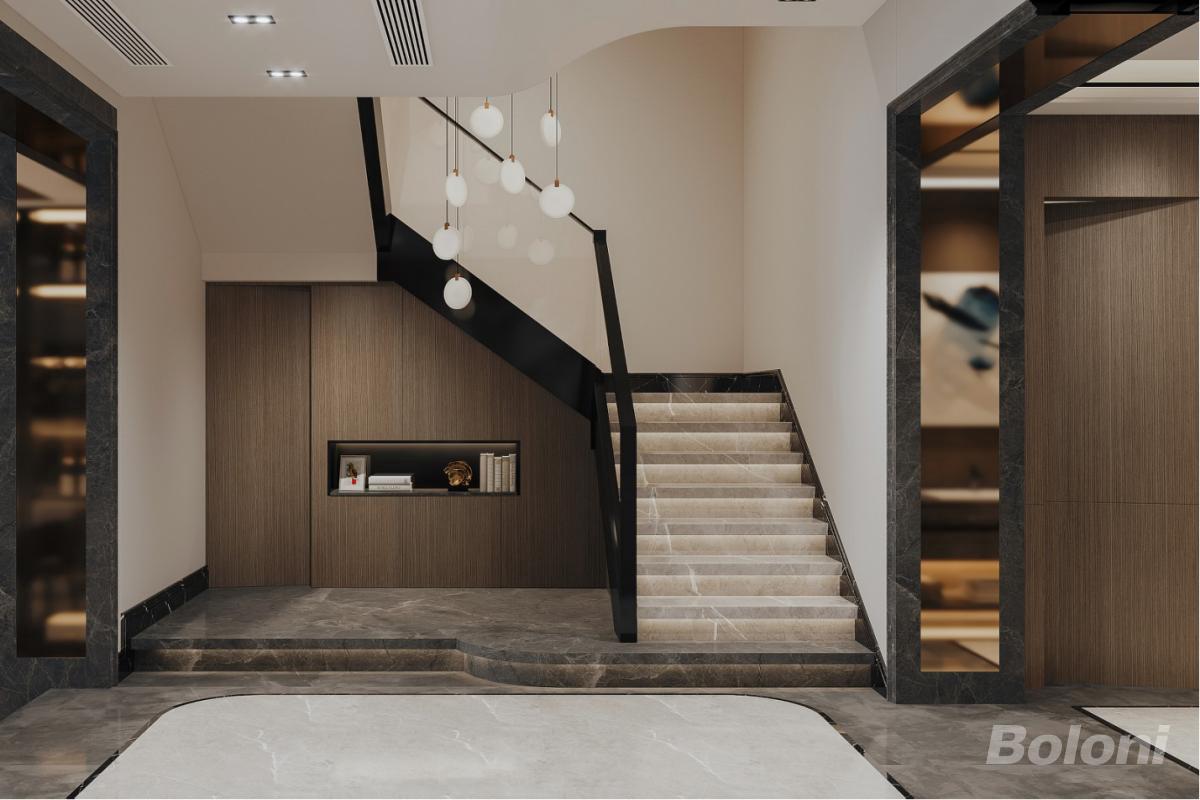 这个轻奢风楼梯间以浅石纹台阶配黑金属扶手,利落显质感;木饰面嵌暗藏灯展示柜,柔化冷硬。球形吊灯垂落,光影晕染空间,弧形地台衔接动线,既作功能过渡,又借材质碰撞与细节点缀,营造出优雅松弛的入户仪式感。