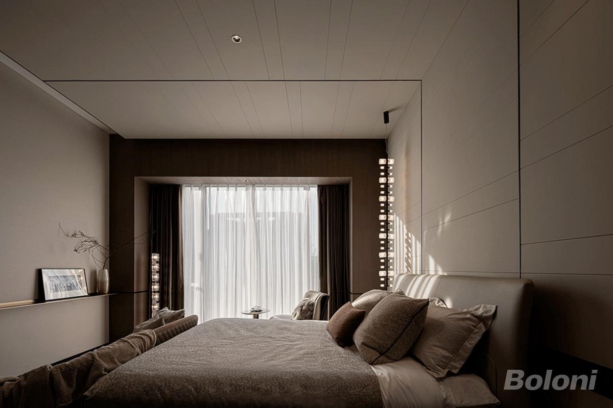 这个轻奢风卧室以暖棕肌理为基底,皮质床头配层次床品,松弛显质感。格栅顶与灯带墙衬光影,落地灯添精致,纱帘滤柔光,枯枝摆件点睛。既保休憩私密,又借材质与光影的克制碰撞,营造出优雅沉静的睡眠氛围。