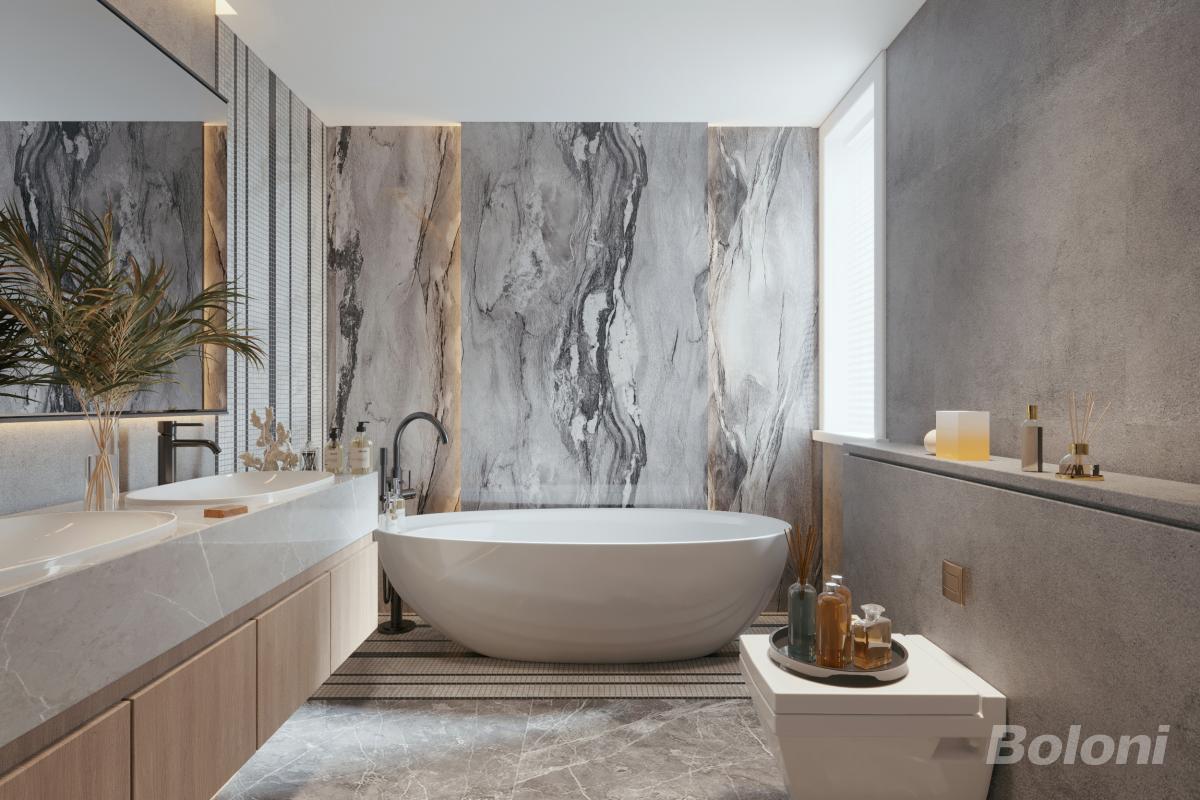 这个轻奢风卫浴以灰调大理石为基底,悬浮双台盆配木饰面柜,利落显质感;独立浴缸衬暗藏灯光,柔化空间冷感。金属件与香氛摆件点睛,百叶窗滤进柔光,既保功能实用,又借材质碰撞与细节点缀,营造出松弛高级的洗漱氛围。