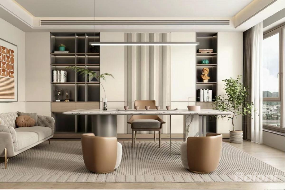 这个轻奢风空间以浅调基底搭棕金软装,大理石桌配金属柱脚,利落显质感。格栅墙衬灯光书架,柔化层次;弧形单椅与绒面沙发添松弛,绿植点睛。既作社交茶区,又借材质碰撞与细节点缀,营造出优雅舒适的互动氛围。