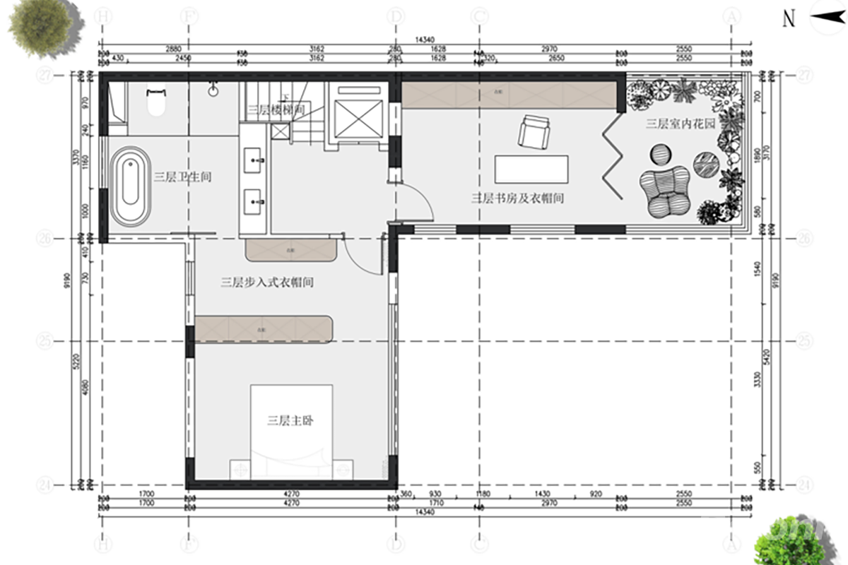 这层轻奢设计,以主卧为核心,联动步入式衣帽间、卫浴,保障私享起居;配套书房与室内花园,松弛感拉满。动线串联功能区,既满足收纳与休憩需求,又借自然元素柔化空间,实用与精致兼具,营造出优雅舒适的主人私域氛围。