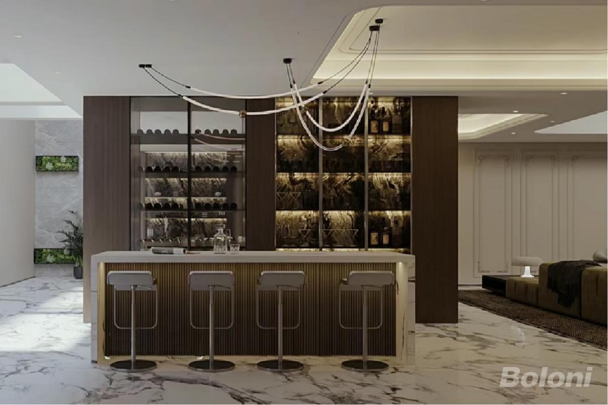 这个轻奢风酒柜区以深棕木饰面配岩板肌理,暗藏灯光衬玻璃柜,精致显层次。弧形链条灯点睛,大理石吧台搭金属吧椅,质感轻盈。空间既作储酒展示,又成社交节点,材质碰撞与光影晕染间,尽显优雅松弛的品饮氛围。