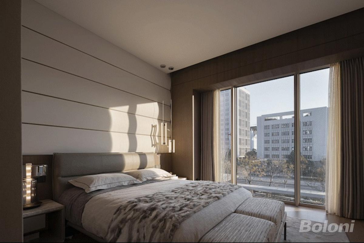 这个轻奢风卧室以浅调肌理墙为基底,皮质床头搭毛绒床品,柔化质感;木饰面衬大窗引城市景,金属灯具点睛。光影透过纱帘晕染空间,既保休憩私密,又借材质层次与自然采光,营造出松弛高级的睡眠氛围。