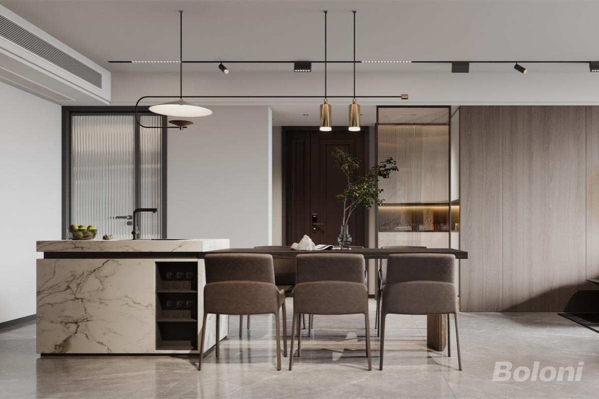 意式轻奢餐桌大理石岛台展自然肌理,金属吊灯添精致。木调与灰调交融显温润,线性灯勾勒层次。材质碰撞间,凝萃意式优雅与轻奢质感,诠释从容用餐美学 。