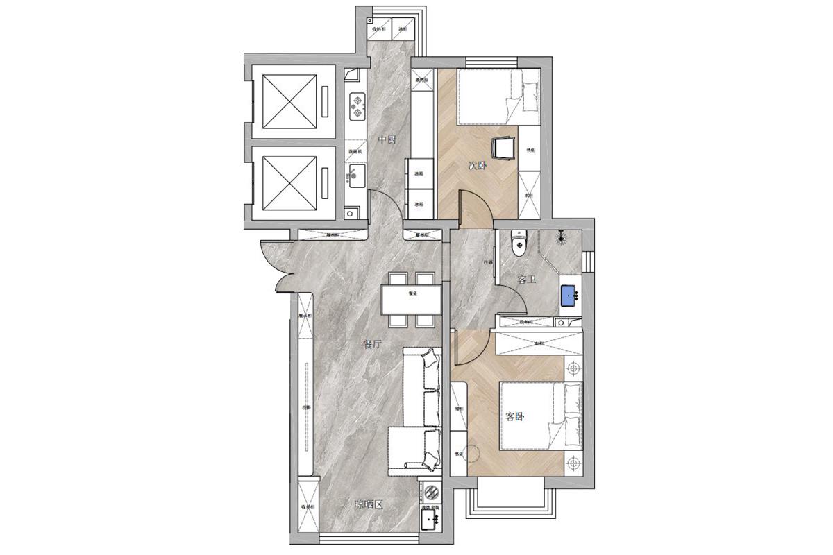 借户型客餐通厅的通透优势,意式轻奢设计以浅灰大理石铺陈公区,香槟金金属勾勒轮廓;卧室用温润木饰面,软装融入丝绒与皮质。利落线条串联空间,精致五金点睛,平衡优雅与松弛,诠释低调奢华的生活格调 。