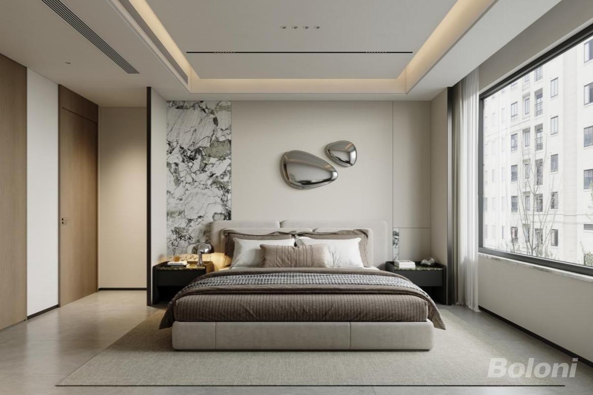 意式轻奢卧室以米棕调铺陈静谧,大理石肌理与金属装置勾勒艺术层次,线性灯柔化边界。质感面料包裹床具,在简约形制里,糅合意式优雅与轻奢细腻,让休憩空间尽显精致松弛的平衡之美 。