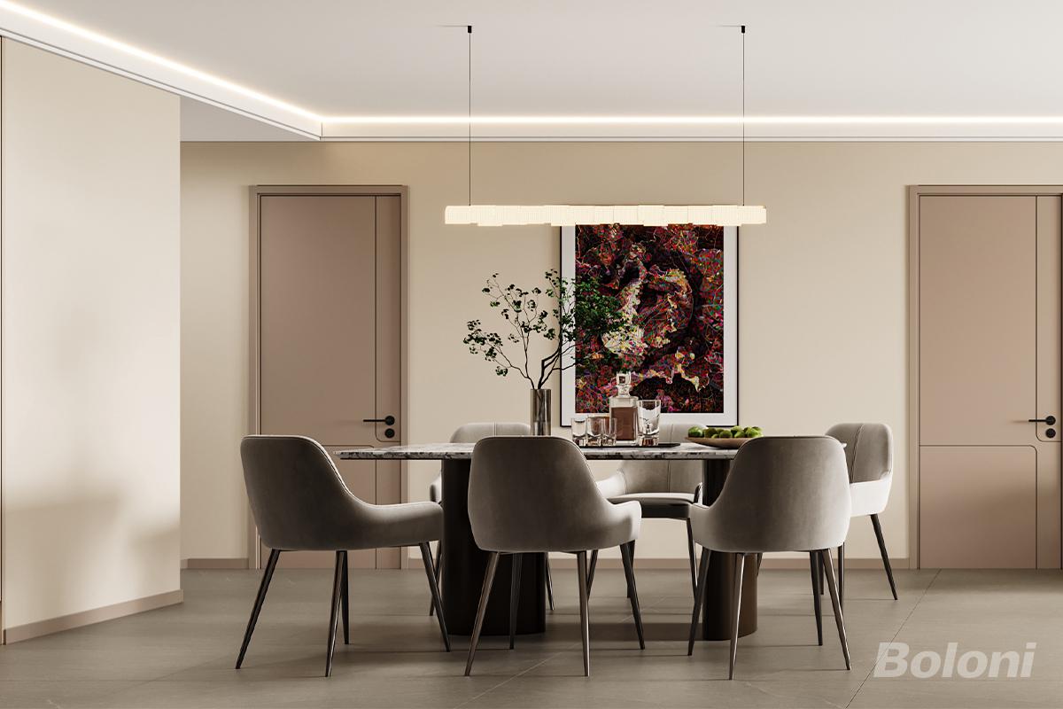 本餐厅以“柔和质感+功能美学”为设计核心,融合用餐、轻食制作与展示功能,打造出兼具舒适与精致感的空间。 一、色彩与材质:低饱和暖调的温柔包裹 - 柜体与墙面:浅米色通顶柜与胡桃木色开放格形成“封闭+开放”对比,开放格内置灯带,提升展示区精致感; - 餐桌与座椅:大理石纹餐桌搭配绒面浅灰餐椅,黑色金属椅腿增添利落感;绿植、玻璃器皿等软装丰富层次。 整体设计通过“色彩柔和化、功能一体化、细节精致化