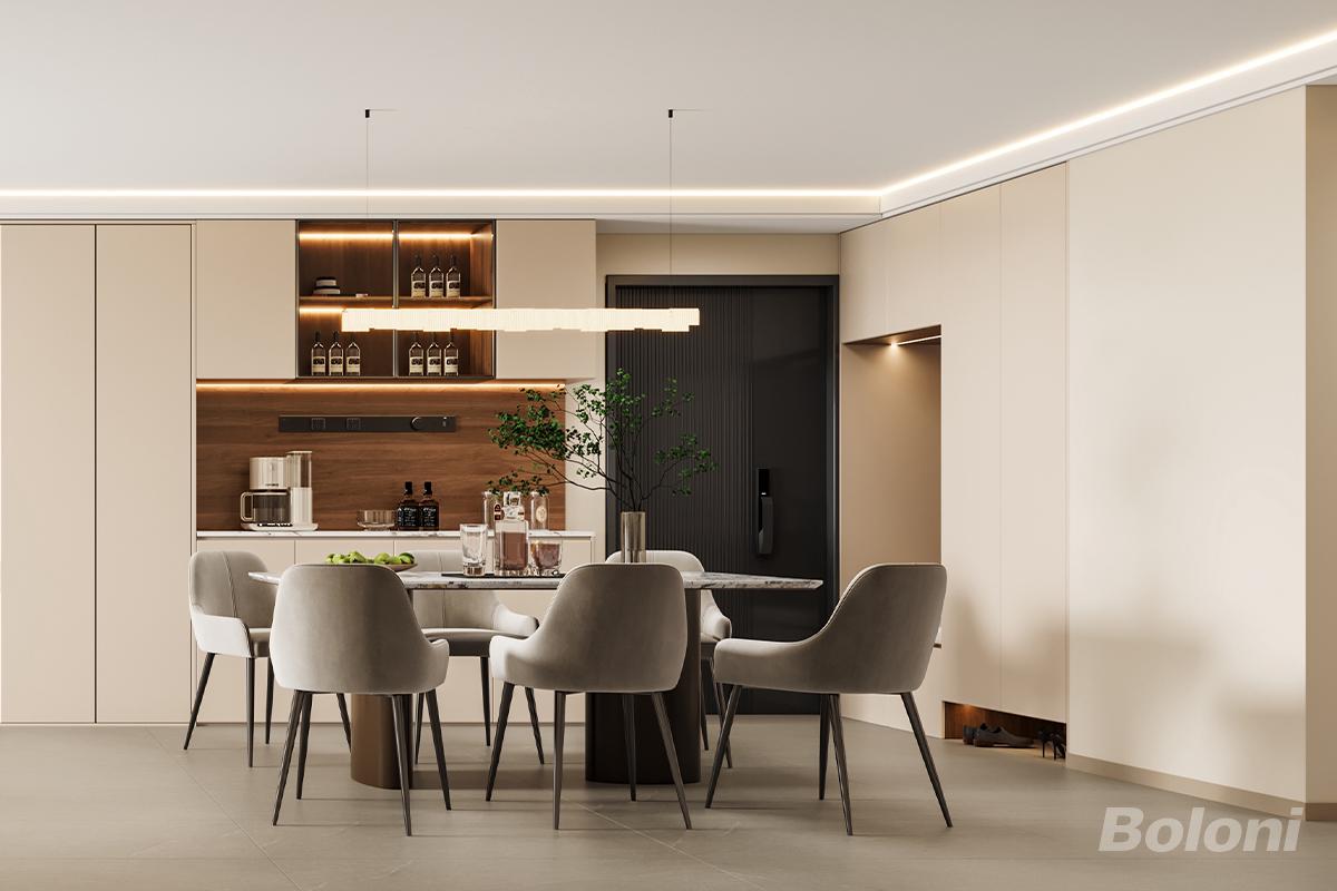 餐桌与座椅:大理石纹餐桌搭配绒面浅灰餐椅,黑色金属椅腿增添利落感;绿植、玻璃器皿等软装丰富层次。 二、功能布局:用餐与轻食的无缝衔接 - 用餐区:居中摆放餐桌,搭配长条形吊灯,营造温馨用餐氛围; - 轻食区:胡桃木色背景墙+白色台面,嵌入咖啡机、水壶等小家电,满足日常轻食制作; - 展示区:开放格陈列酒瓶、餐具,灯带设计强化展示效果。 三、氛围营造:光影与细节的治愈感 适配现代都市人的居家
