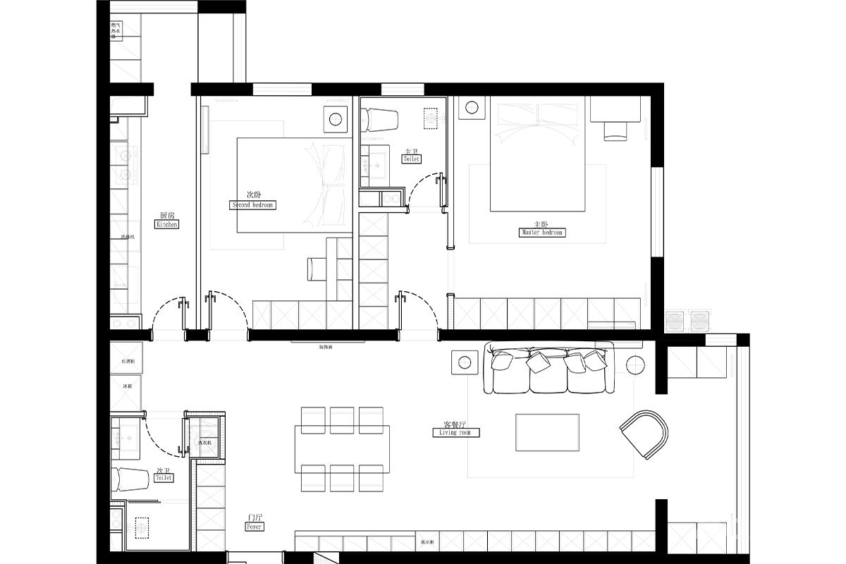本住宅设计为两室一厅一厨一卫格局,以“空间高效利用、动线流畅自然”为核心,适配现代家庭生活需求。 一、空间布局:功能分区与互动融合 - 公共区域:客餐厅一体化设计,客厅(沙发+茶几)与餐厅(餐桌+餐椅)无缝衔接,增强家庭互动;厨房为L型布局,紧邻餐厅,实现“烹饪-用餐”动线最短。 - 私密区域:主卧、次卧分列主卫两侧,主卧带独立空间感,次卧布局紧凑实用,主卫干湿分离(马桶+洗手台)提升使用效率