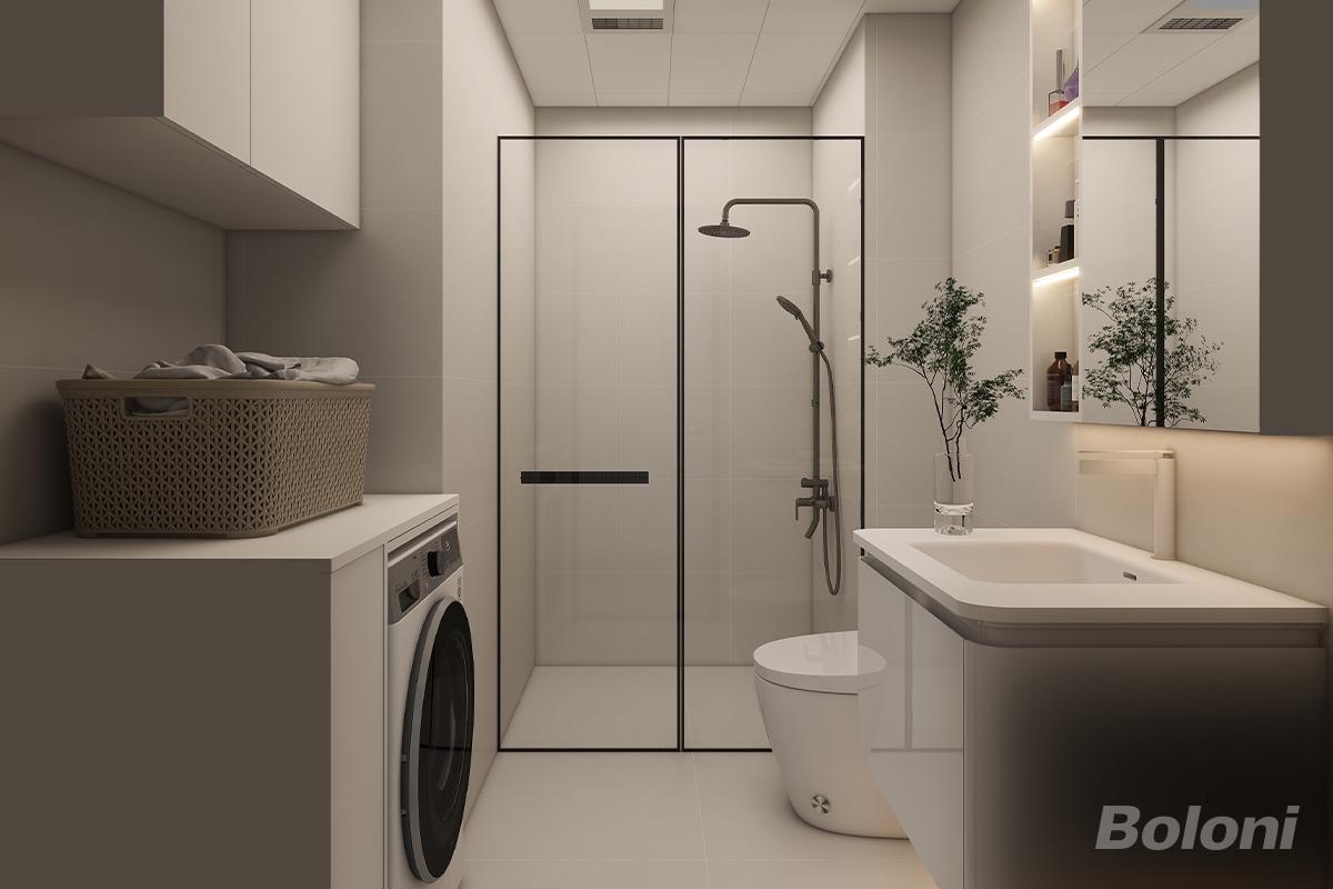 本卫浴空间以“柔和治愈+高效实用”为核心,将奶油风的温润质感与现代简约的利落线条融合,打造出甜而不腻的洗漱、沐浴与洗衣一体化空间。整体以低饱和暖调为基底,通过了色彩、材质与细节的三重设计,实现“视觉松弛+功能流畅”的双重体验。 一、空间布局:功能联动的高效利用 - 干湿分离:淋浴区以黑色细框玻璃门隔断,搭配奶油白哑光砖墙面,既保证通透感,又避免水花飞溅; - 洗衣+洗漱联动:洗衣机嵌入定制柜。