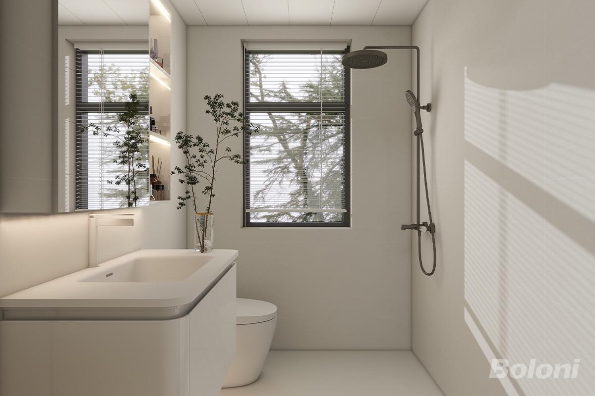 本浴室以“自然光影+极简功能”为设计核心,打造出兼具实用与治愈感的卫浴空间。 一、色彩与材质:柔和质感的空间基底 - 墙面与地面:浅米色通体瓷砖覆盖墙面与地面,弱化空间边界感,营造“整体化”视觉效果; - 五金与家具:黑色金属淋浴花洒、白色陶瓷洁具形成“黑+白”的经典对比,简约利落。 整体设计通过“色彩柔和化、功能一体化、自然融入化”,让浴室成为“放松身心、享受洗浴”的理想场景,适配现代需求。
