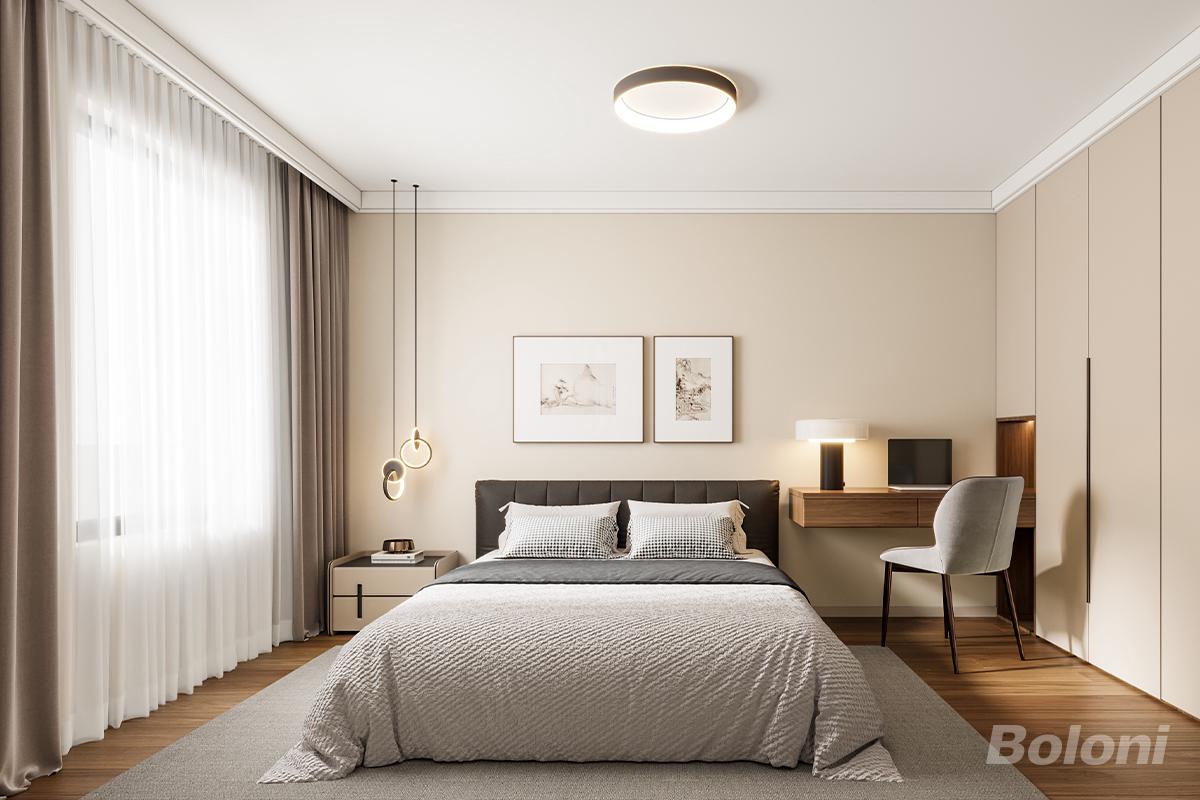 本卧室以“柔和静谧+功能融合”为设计核心,将现代简约的利落感与奶油风的温润质感结合,打造出兼具休憩与工作功能的治愈空间。 一、色彩与材质:低饱和暖调的温柔包裹 - 墙面与柜体:浅米色墙面搭配同色系通顶衣柜,弱化柜体存在感;胡桃木色地板+浅灰地毯,通过“木色+暖灰”平衡视觉层次; - 床品与软装:浅灰床品搭配深灰床尾毯、格纹抱枕,黑色皮质床头形成“深浅碰撞”;两幅水墨挂画增添东方意境,避免太单调