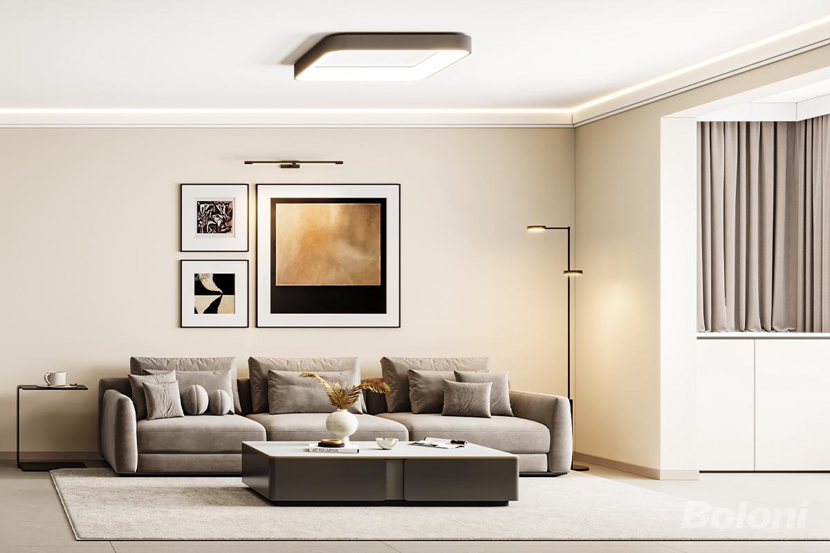 本客厅以“极简线条+暖调质感”为设计核心,通过色彩、材质与功能的三重融合,打造出兼具收纳与展示功能的高级感空间。 一、色彩与材质:采用低饱和暖调的温柔包裹 - 柜体设计:浅米色通顶柜与胡桃木色开放格形成“封闭+开放”形成对比,玻璃门格内置了灯带,提升展示区精致感; - 地面与软装:浅灰地毯搭配深咖色茶几,通过“暖灰+深咖”平衡视觉层次;茶几上的白色花瓶、干花与柜体摆件呼应,强化了整体的风格。