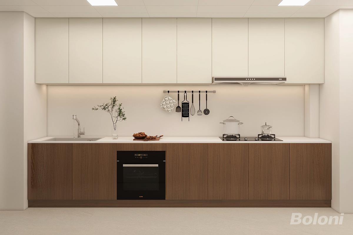 本厨房以“柔和质感+高效实用”为核心,将奶油风的温润与现代简约的利落融合,打造出治愈系烹饪空间。整体以低饱和暖调为基底,通过色彩、材质与细节的三重设计,实现了“视觉松弛+操作流畅”的双重新鲜体验。 一、色彩与材质:暖调基底的温柔包裹 - 柜体设计:上柜采用奶白色肤感板,下柜选用胡桃木色木纹板,通过“浅暖+深木”的色彩碰撞,平衡视觉层次; - 台面与墙面:通铺奶油白石英石台面+同色系微水泥墙面。