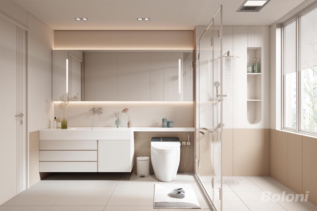 卫生间整体色调以暖色系为主,利用镜柜加浴室柜台面延申增加了储物空间,淋浴房采用壁龛设计也增加了储物空间
