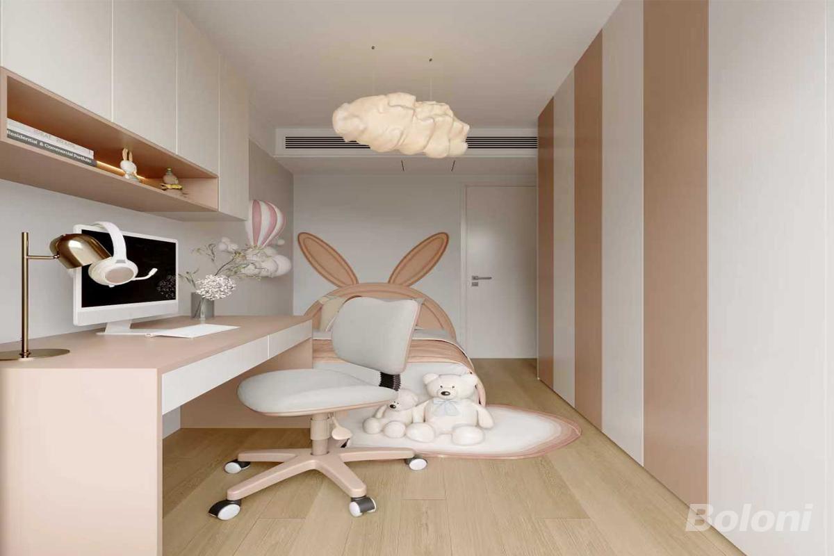 整体空间色调以粉色白色搭配为主,书桌上方设置吊柜增加储物空间,衣柜侧面采用开放格加玻璃门设计用于展示小朋友喜欢的手办,儿童床采用可爱的兔子床设计搭配整体空间的粉色,整体空间充满童趣
