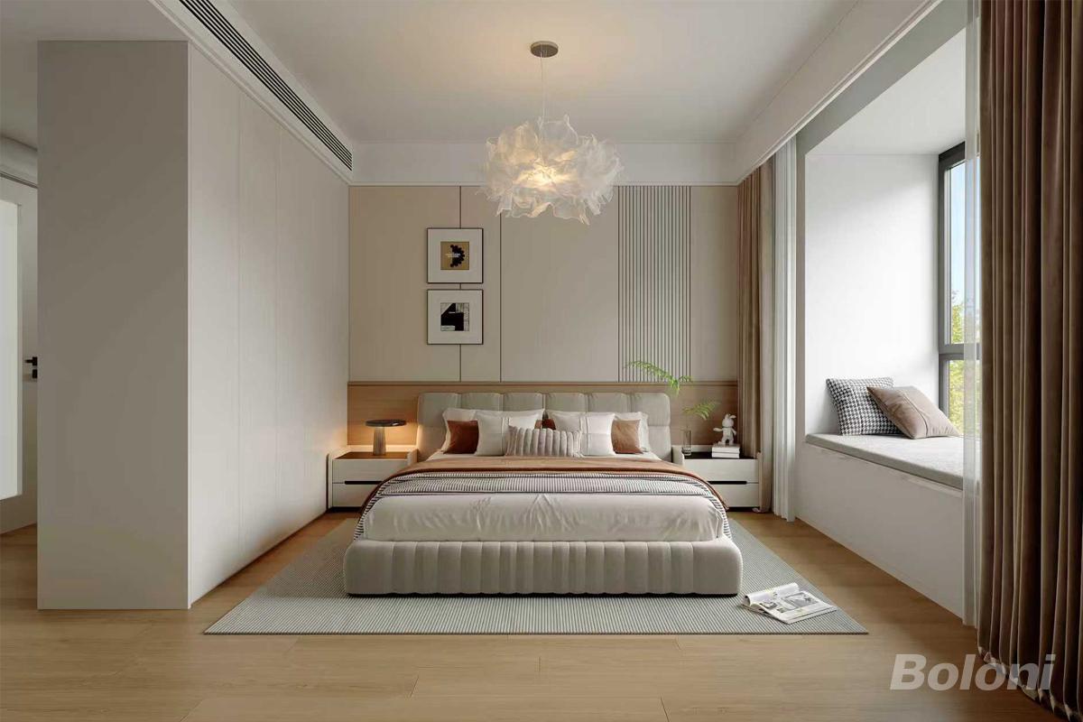 主卧空间相对较大,在主卫与床之间增加衣帽间对卫生间门对着床的问题进行了遮挡同时增加了储物空间,利用原有飘窗 增加了休闲空间