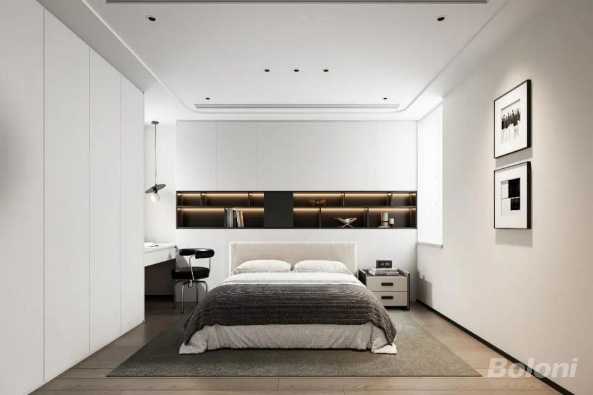 卧室以纯净白为基底,嵌入黑灰开放式置物架 + 暗藏灯槽,简约中见层次。床品用灰调肌理织物,搭配金属细框边柜,黑白艺术画与极简吊灯点缀精致感,整墙收纳与一体化布局兼顾实用,在极简线条里透出低调奢华的松弛感。