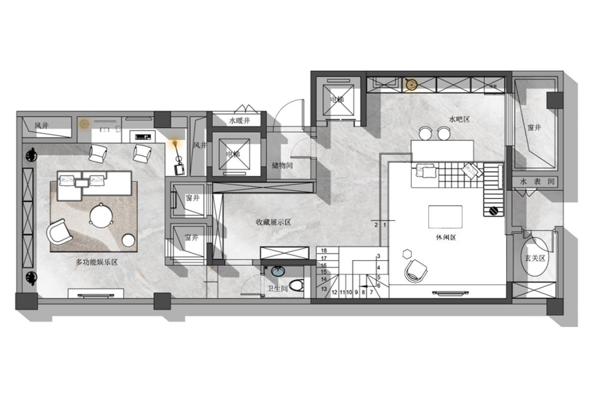 该空间以轻奢为基调,分区清晰:多功能娱乐区承载休闲互动,收藏展示区适配藏品陈列,水吧 + 休闲区营造松弛氛围,动线流畅且功能复合。利用通透布局弱化设备区,以精致软装呼应轻奢质感,既满足多元需求,又在实用中透出高级格调。