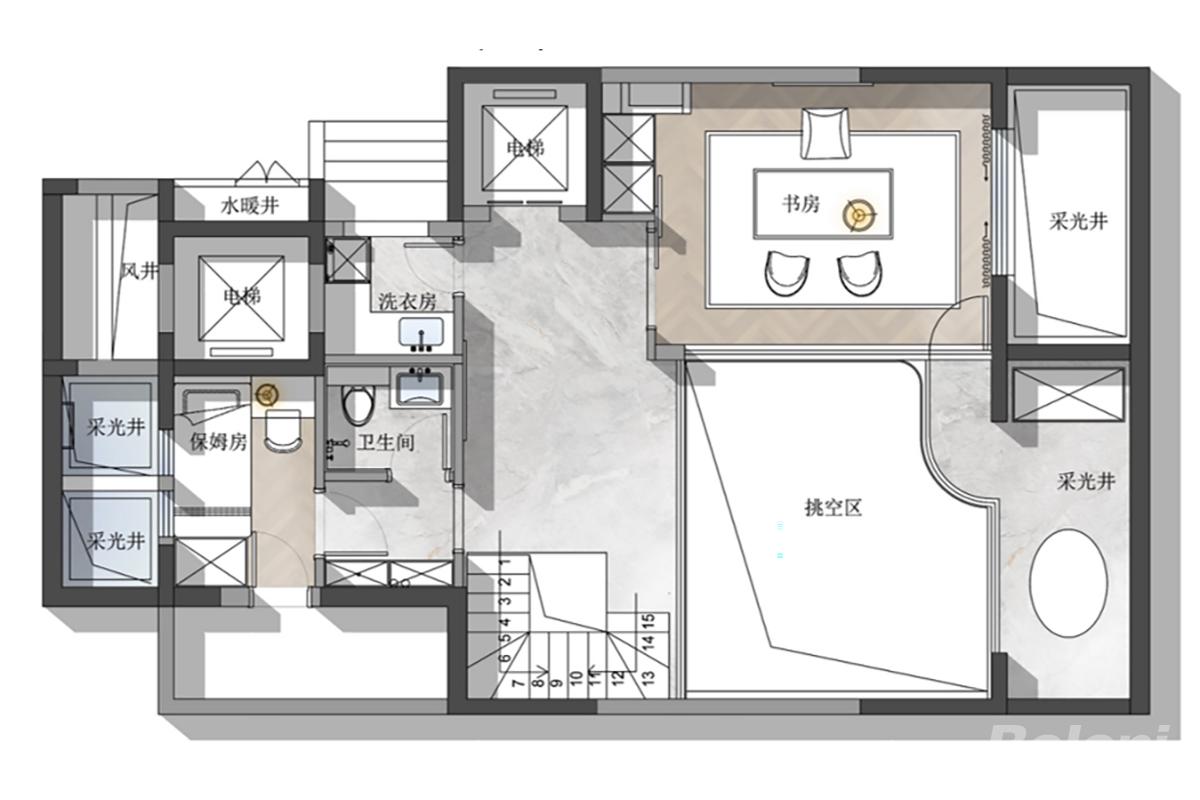 该空间为轻奢风复式布局,功能分区清晰:设书房满足办公需求,挑空区增强空间通透感,配套保姆房、洗衣房及独立卫浴,兼顾实用与隐私。利用多采光井引入自然光线,动线流畅且设备区隐蔽,在精致布局中平衡功能与轻奢质感,适配高品质居住需求。