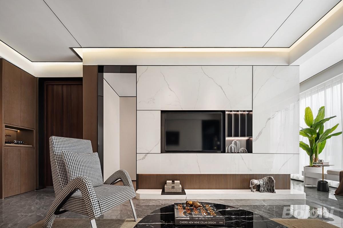 客厅以白纹大理石为背景主调,搭配深棕木色柜体与金属线条,营造简约高级感。千鸟格单椅增添复古精致,暗藏灯槽与金属摆件点缀细节,悬浮式地台 + 通透材质平衡轻盈与质感,整体在克制中尽显轻奢格调。