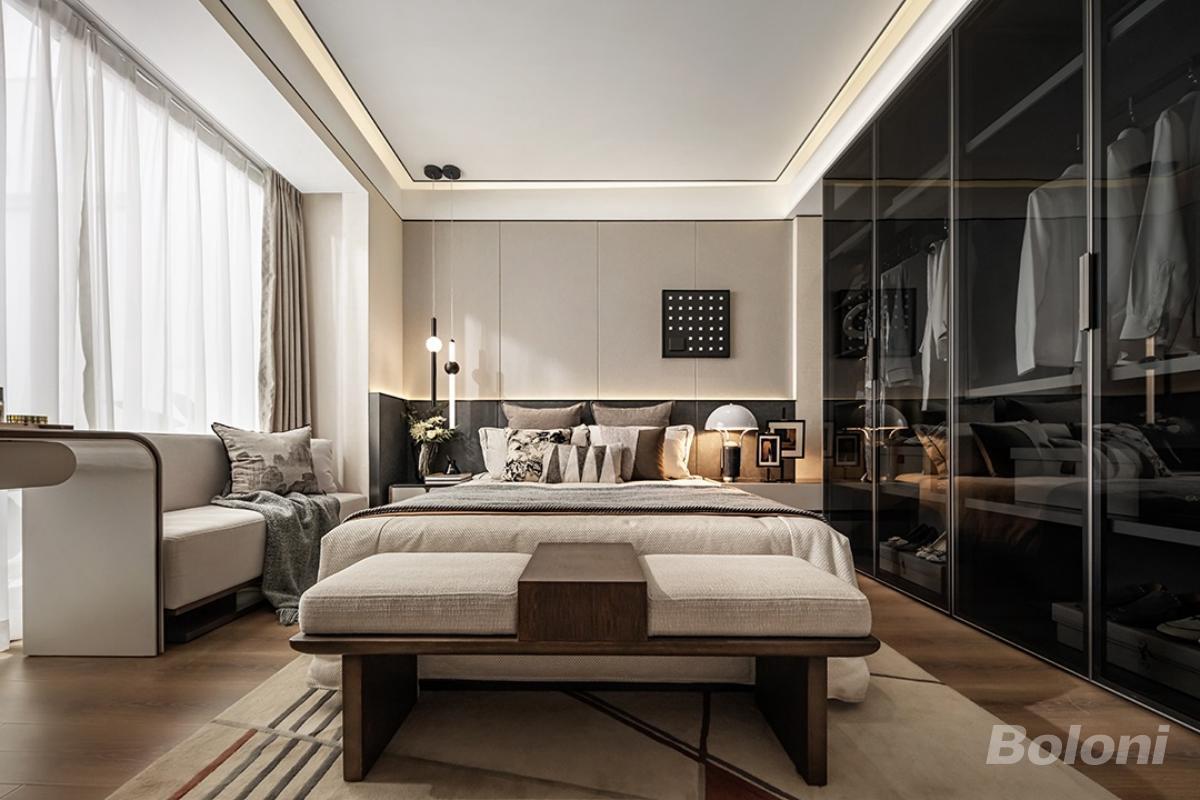 卧室以暖米色为基底,黑玻衣柜 + 金属细节提亮质感,暗藏灯槽柔化氛围。床品用肌理织物搭艺术抱枕,木质床尾凳与拼色地毯添层次,极简吊灯与几何装饰画点缀精致,在舒适松弛的基调里,以材质碰撞与细节设计,诠释低调奢华的寝居格调。