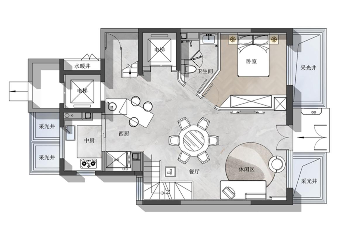 该轻奢风空间采用中西厨分区设计,西厨联动餐厅增强互动,中厨保障实用功能。卧室近卫浴兼顾隐私,休闲区与餐厅形成通透公区,多采光井引入自然光线。动线流畅且功能复合,以简约布局适配轻奢质感,既满足日常起居,又显精致生活格调。