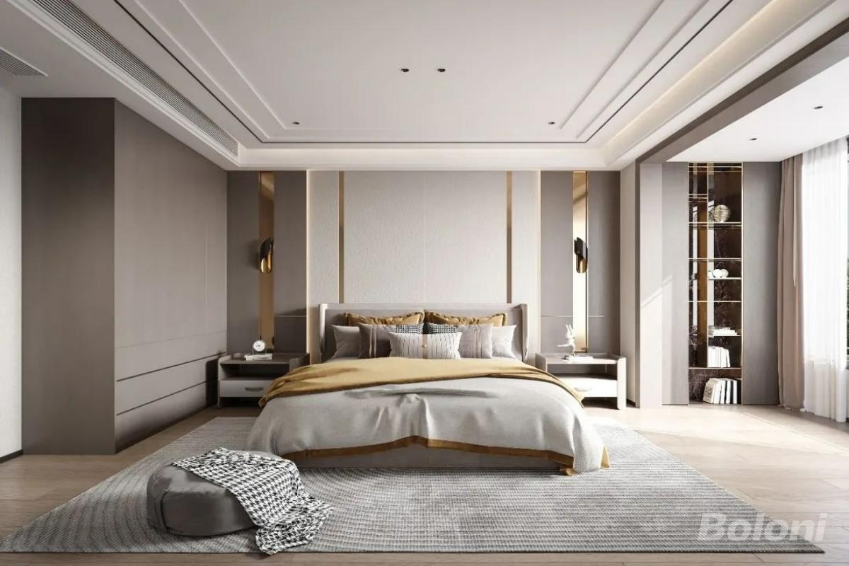 卧室以浅灰为主调,床头背景融入金色线条与肌理饰面板,暗藏灯槽柔化氛围。床品用米白搭暖金边饰,千鸟格元素添精致,金属边柜与玻璃展示架呼应轻奢质感,整体在静谧基调中,以细节金属与软装层次,平衡舒适与高级感。