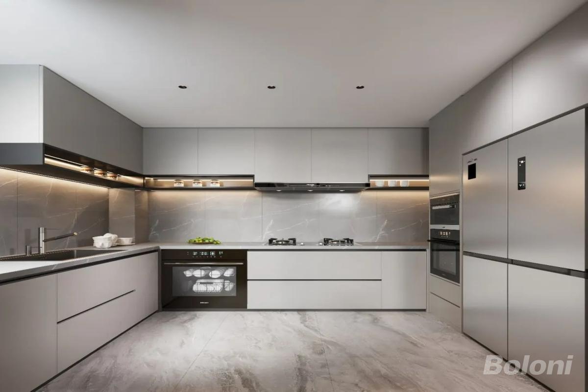 厨房以高级灰为主调,搭配石纹岩板与哑光柜面,质感细腻。暗藏灯槽勾勒层次,嵌入式厨电 + 隐形拉手强化简约,金属五金与冷调材质碰撞出精致感,在实用功能中融入低调奢华,让烹饪空间兼具高级感与利落氛围。