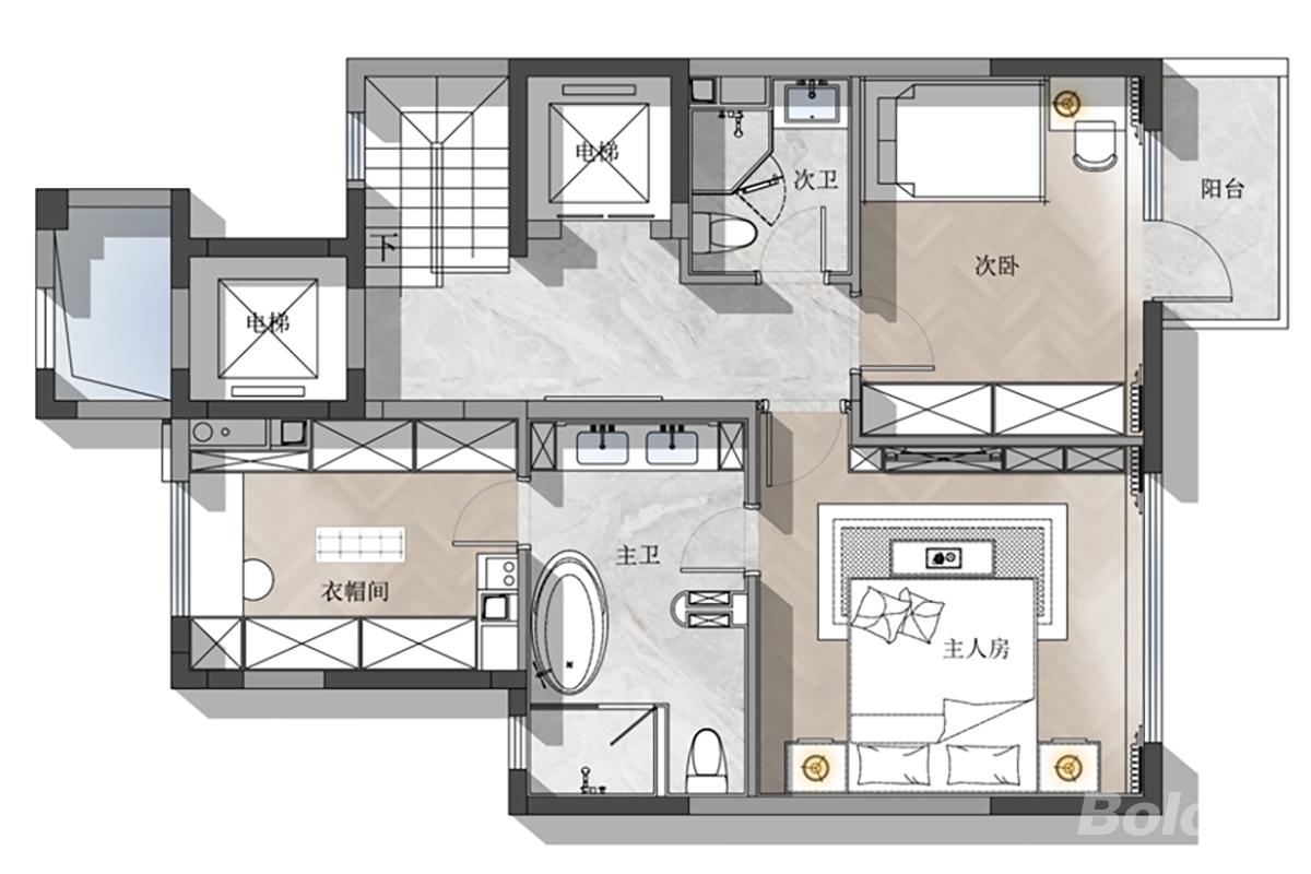 该轻奢风卧室套间布局,以主人房为核心,配独立主卫(含浴缸)与衣帽间,保障隐私与奢适;次卧近次卫及阳台,兼顾实用。公区动线流畅,设备区隐蔽,以分区明确的布局适配轻奢质感,既满足起居功能,又通过独立套房设计凸显精致居住格调。