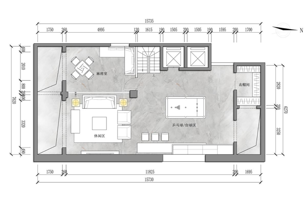 该轻奢风休闲空间分区清晰:设麻将室、台球 / 乒乓球区承载娱乐功能,休闲区适配放松互动,衣帽间兼顾收纳。动线流畅且功能复合,以通透布局弱化边界,搭配精致软装可呼应轻奢质感,既满足多元休闲需求,又在实用中透出高级格调。
