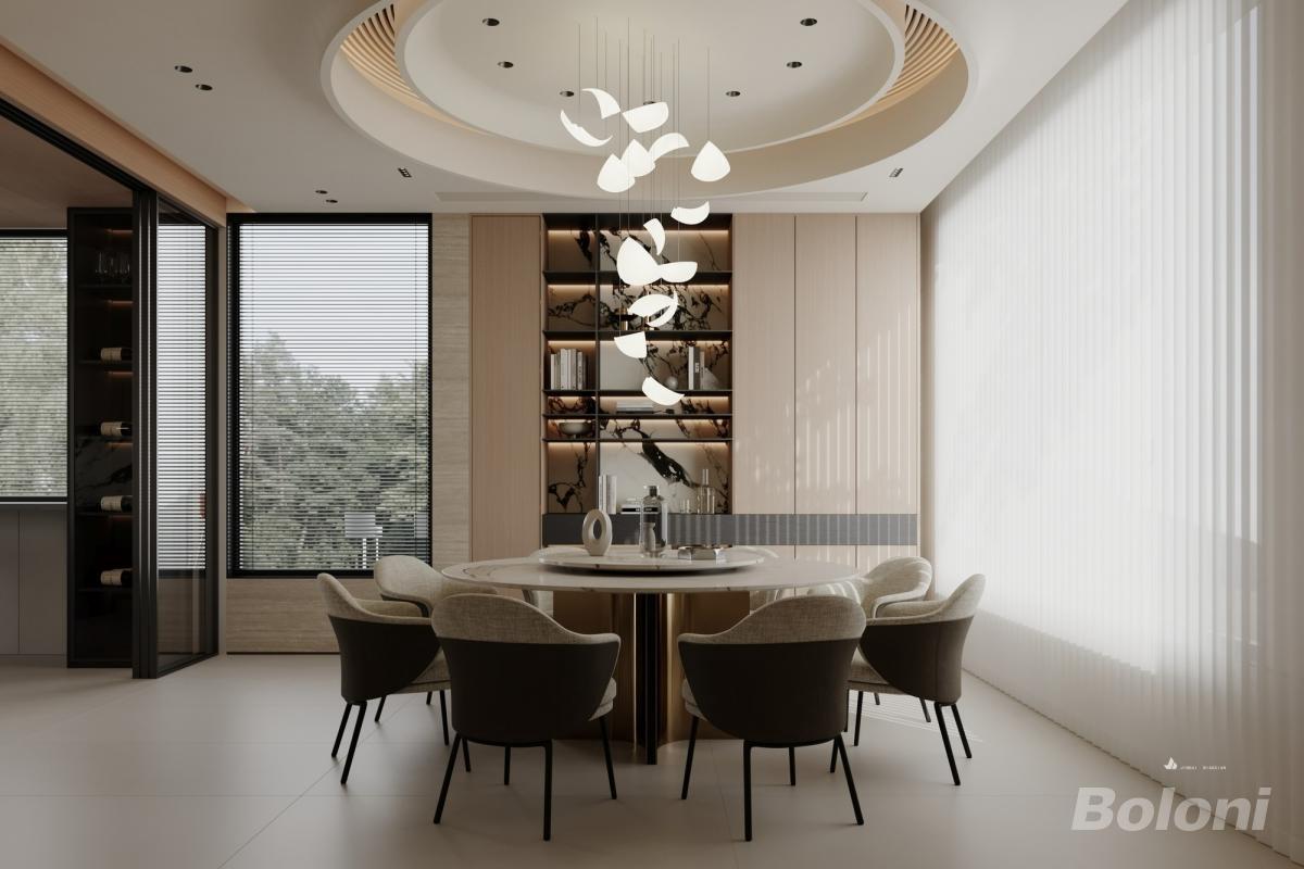 餐厅以暖米为基底,圆形吊顶 + 艺术吊灯打造视觉焦点,大理石纹展示柜配暗藏灯槽,质感与氛围兼具。浅白餐桌搭撞色餐椅,黑金属细腿添精致,通透百叶窗引自然光,在柔润色调与细节材质的碰撞中,既显优雅格调,又保用餐舒适感。