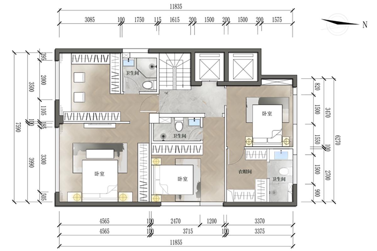 该轻奢风卧室套间布局,设多间卧室适配居住需求,主卧配独立衣帽间与卫浴保障奢适隐私,公卫兼顾便捷。动线流畅且功能分区清晰,以通透布局弱化空间边界,搭配精致软装可呼应轻奢质感,既满足多人起居,又显舒适高级的居住格调。