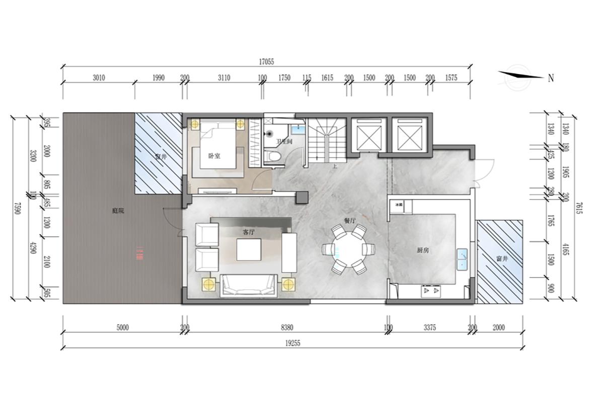 该轻奢风空间布局通透:客厅联动庭院引自然景,餐厨区近厨房增强互动,卧室配独立卫浴保障隐私。动线流畅且功能分区清晰,设备区隐蔽,以庭院衔接室内外空间,搭配精致软装可呼应轻奢质感,既满足起居需求,又显舒适高级的生活格调。